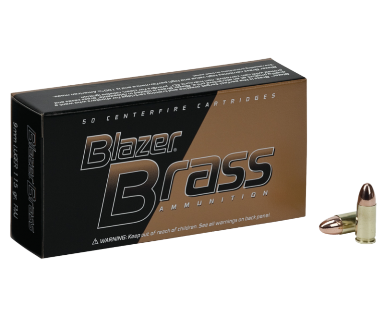 CCI Blazer Brass delivers consistently, reliability, and accuracy in ammuntion made with reloadable brass casings, quality primers, and clean-burning propellants. Each box contains 100 rounds of 115 grain 9mm with full metal jacket bullets.
