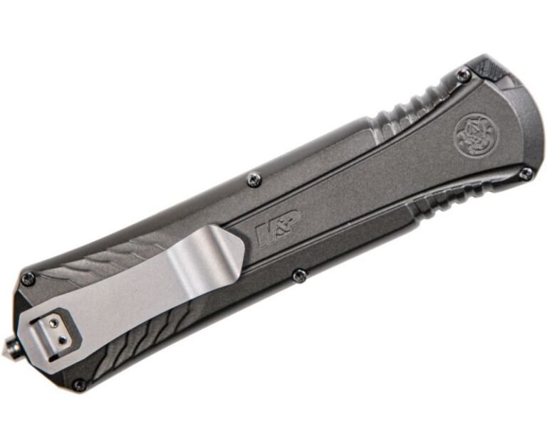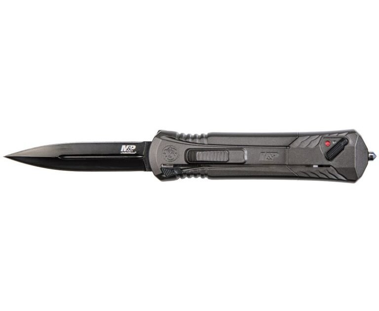 The MPOTF10G is an assisted opening OTF knife from Smith & Wesson. It has a safety and a tab on the side used to retract the blade in addition to the thumb slide. The mechanism takes a little getting used to, but it truly is an awesome and impressive knife. Built with tactical intent in mind, the MPOTF10G has a slender profile and a tactical black finish. The AUS-8 stainless steel blade is 3.5″ long and forged into a double edge dagger, very reminiscent of a Benchmade or Microtech OTF Automatic. The aluminum handles are contoured for a better grip and include a glass breaker pommel, a pocket clip, and a safety lock