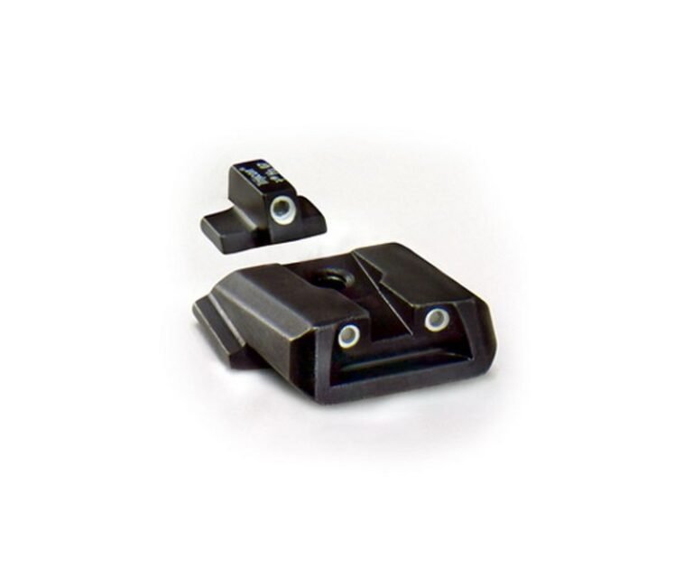3-dot sight system. Gives shooters 5x greater night fire accuracy. Patented shock-resistant design used exclusively by Trijicon. Glowing Traser tritium gas-filled lamps are warranted for full 12 years. Precision machined metal body. Polished sapphire windows impervious to solvents & puncture fitted inside the aluminum cylinders that contain & protect the glass lamps. Large front dot for extra distinction & brightness. Inlaid white paint rings. Silicone rubber cushions the glass lamp